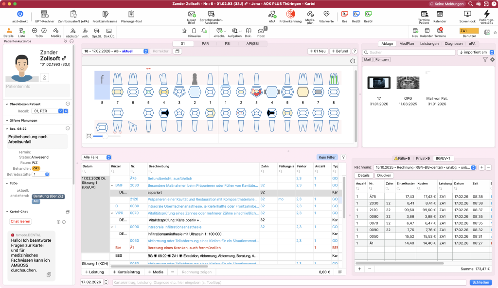 Auch BG- und UV-Fälle können in tomedo.Dental direkt bei der Patientenaufnahme erfasst und dokumentiert werden. Eine zielgerichtete Leistungserfassung und Abrechnung ist so problemlos möglich.
