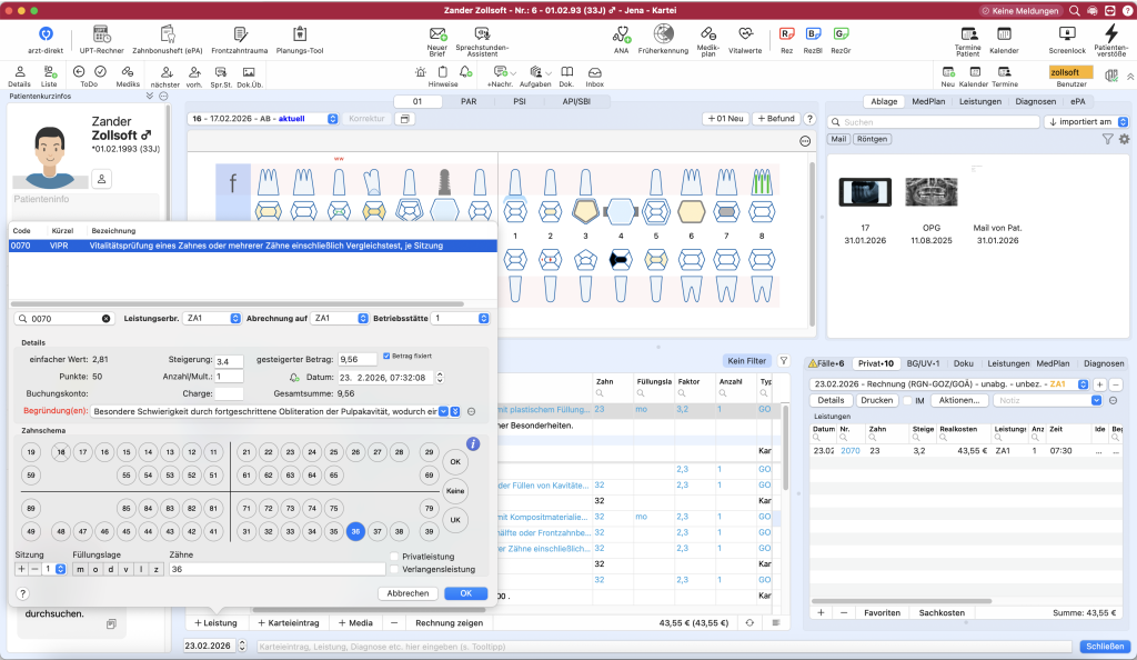 Auch BG- und UV-Fälle können in tomedo.Dental direkt bei der Patientenaufnahme erfasst und dokumentiert werden. Eine zielgerichtete Leistungserfassung und Abrechnung ist so problemlos möglich.