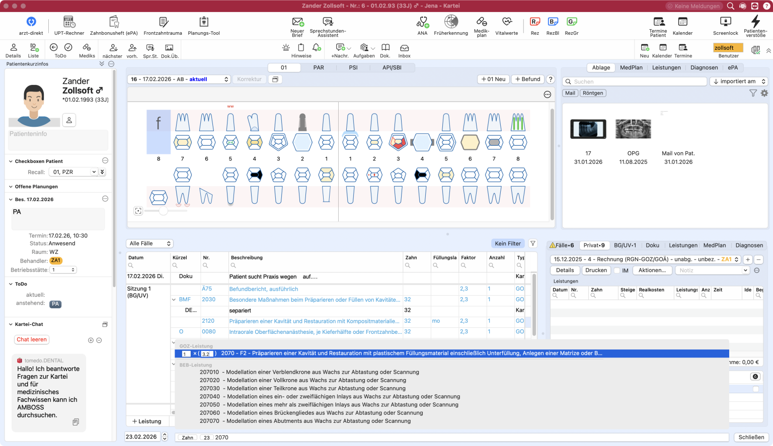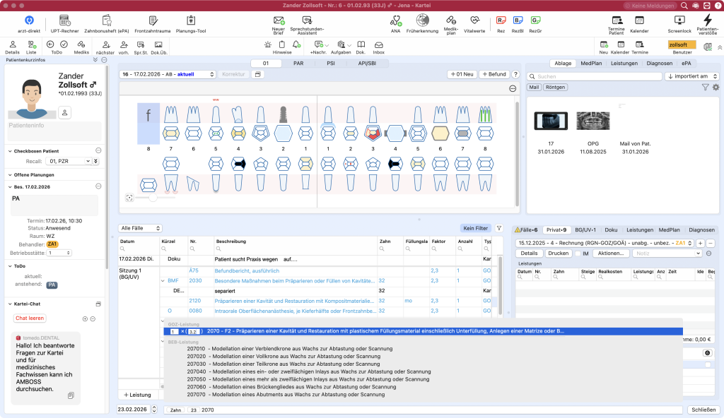 Auch alle Leistungen nach dem GOZ-Regelwerk lassen sich in tomedo.Dental direkt in der Patientenakte suchen und der Abrechnung hinzufügen. Um Zeit und Klicks bei der Abrechnung zu sparen, können Sie Leistungsfavoriten anlegen.